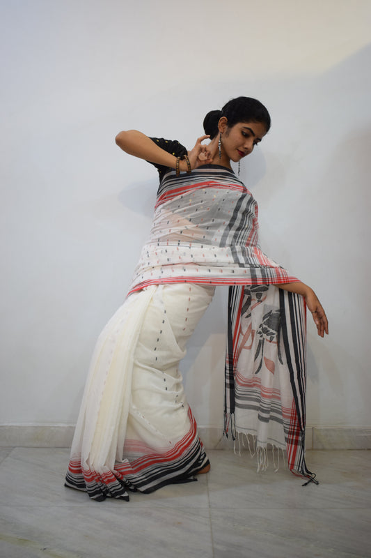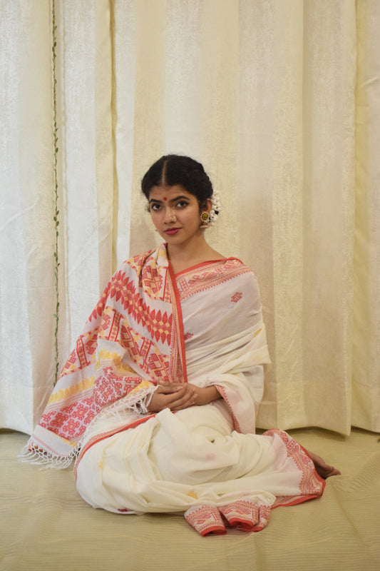Shubratha: White & Red Khandua Sachipar cotton saree