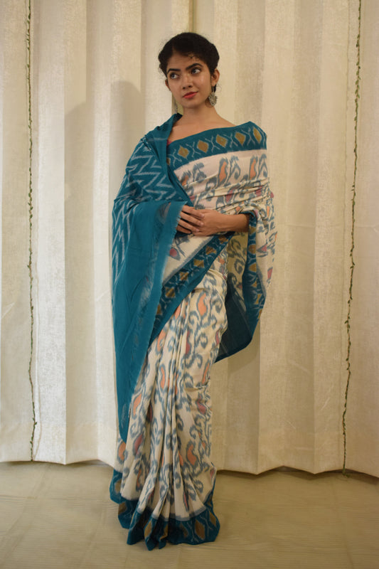 Vasundharā- White & Green Cotton Pochampally Ikat Saree