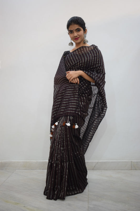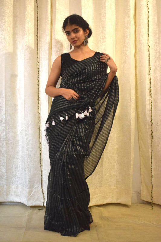 Ojaswini - Black Cotton-Zari Stripes Saree
