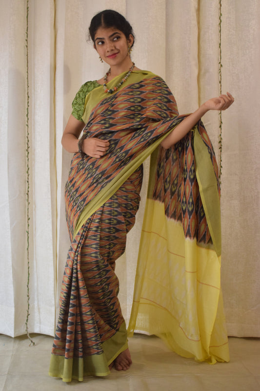 Urvija: Terracota & Yellow Cotton Pochampally Ikat Saree
