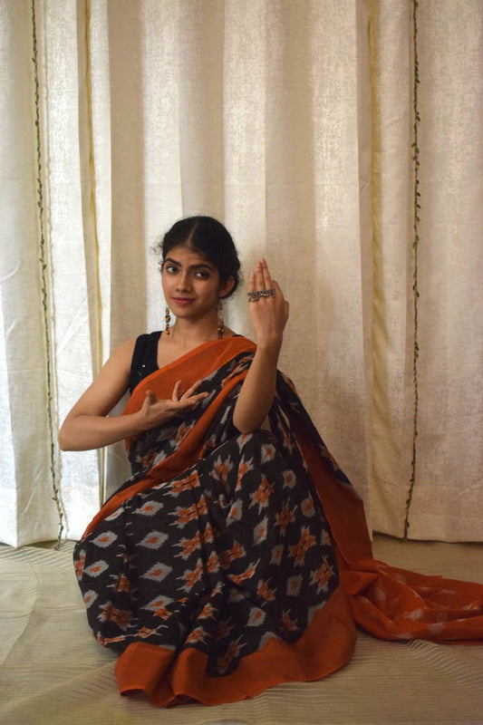 Yamini: Black & Orange Cotton Pochampalli Ikat Saree
