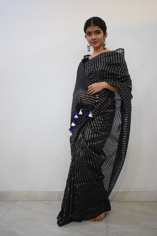 Ojaswini - Black Cotton-Zari Stripes Saree