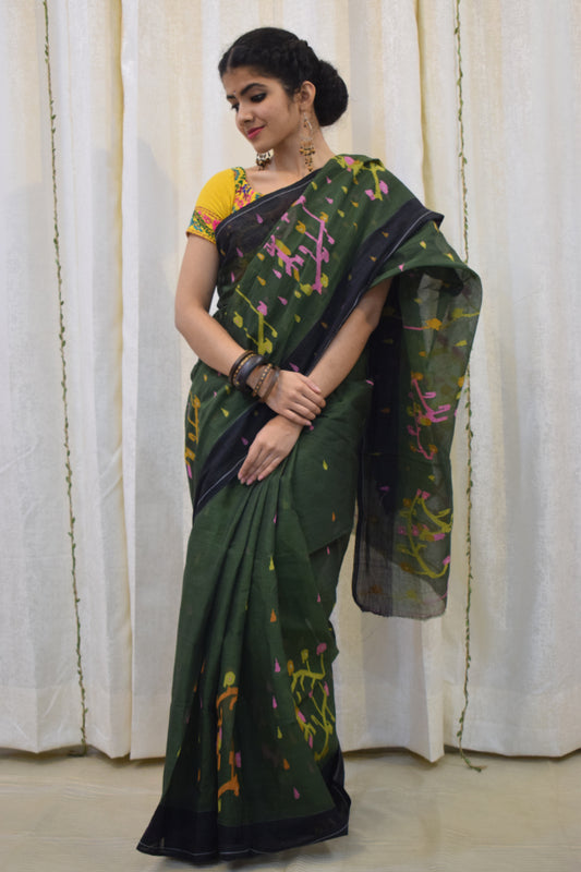 Urvi: Henna Green Khadi Cotton Jamdani Saree