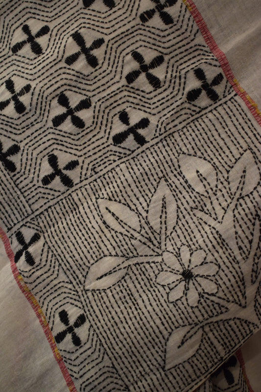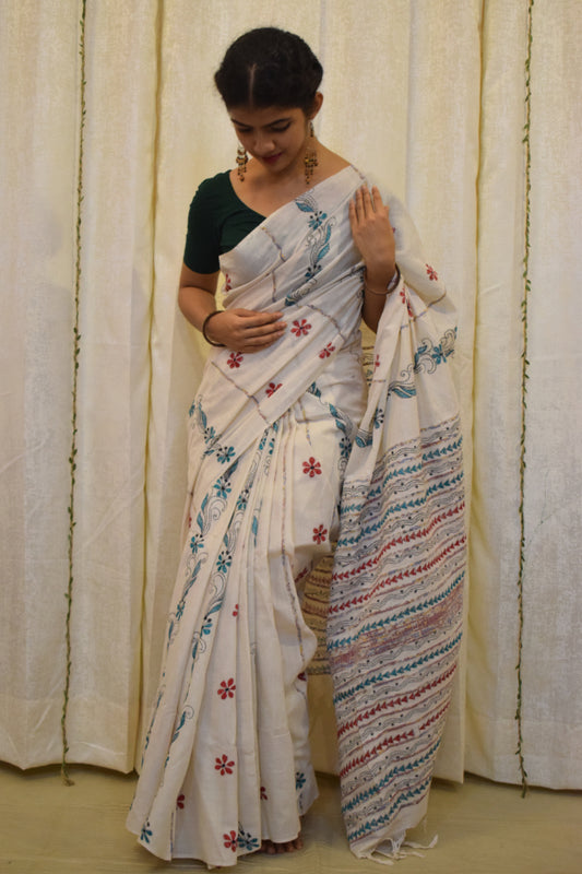 Kairavi: Ivory White Khadi Cotton Kantha Saree