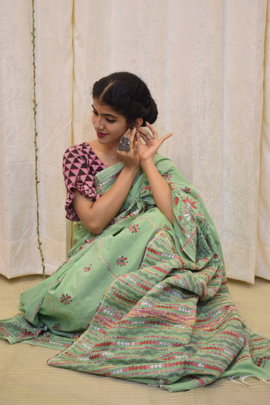 Revati: Pistachio Green Khadi Cotton Kantha Saree