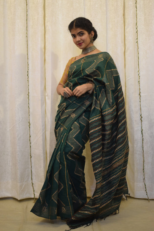 Bhuvi: Forest Green Khadi Cotton Kantha Saree