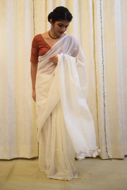 Saraswati: Pearl White Mulmul-Zari Stripes Saree