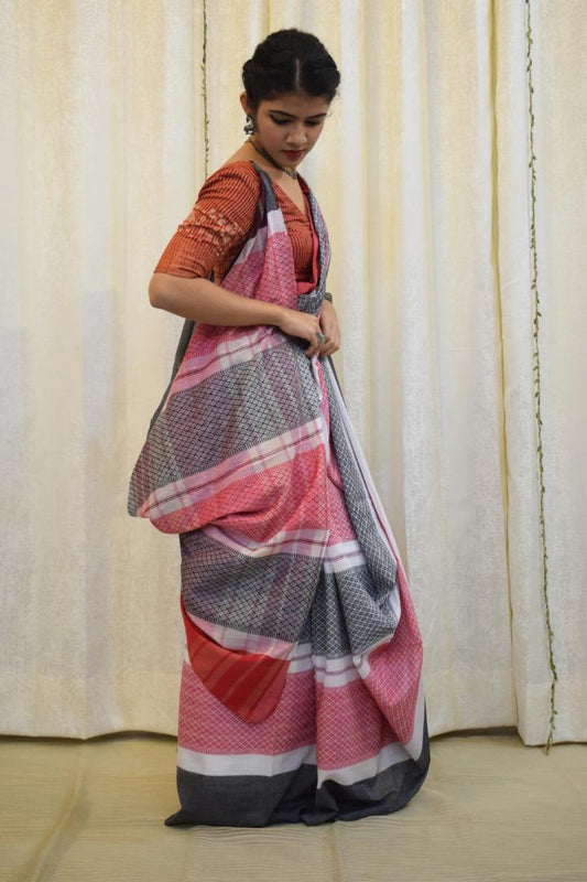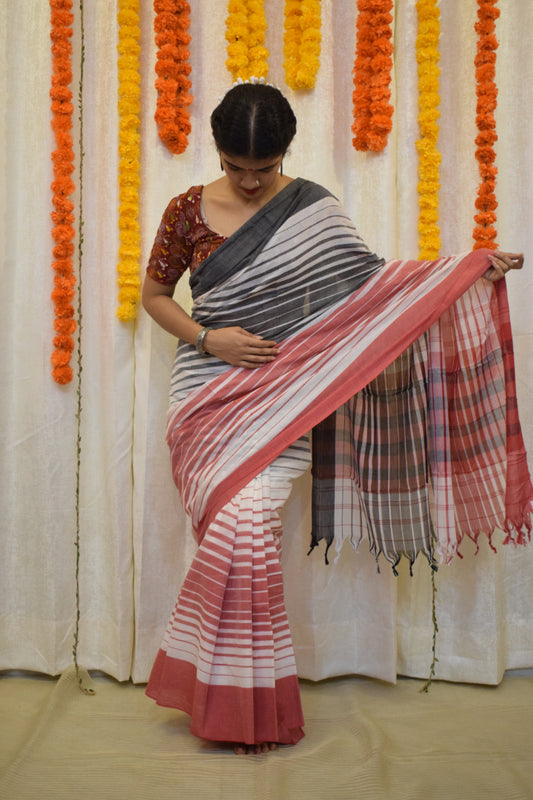 Toshani: Red & Grey Dhaniakhali Cotton Saree