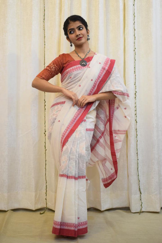 Sādhavi: White & Red Dhaniakhali Cotton Saree