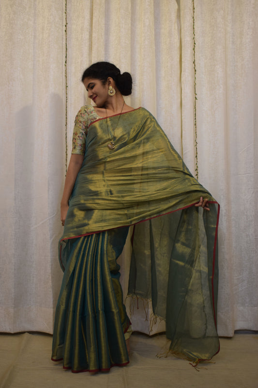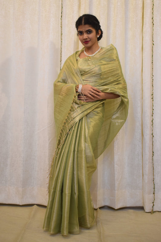 Nivritti: Pistachio Green Mul-Zari Tissue Saree