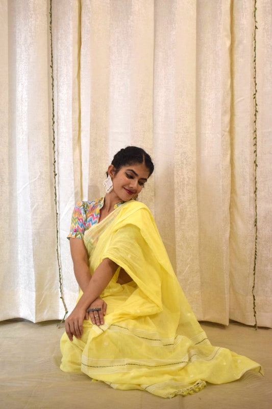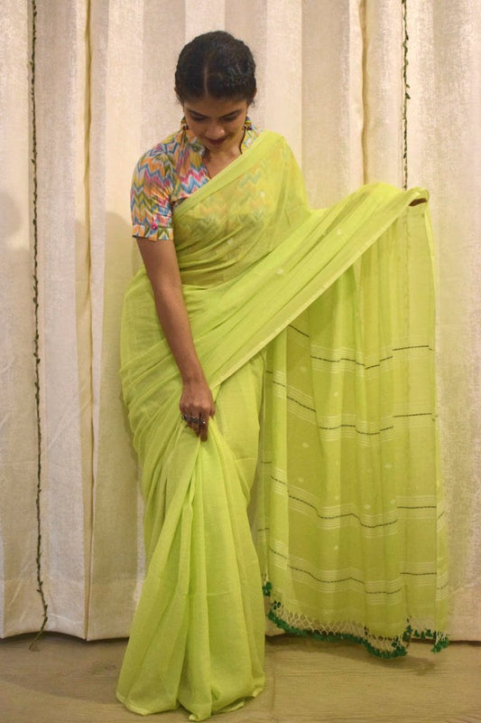 Pavani: Turqoise Blue Mulmul Buti Saree