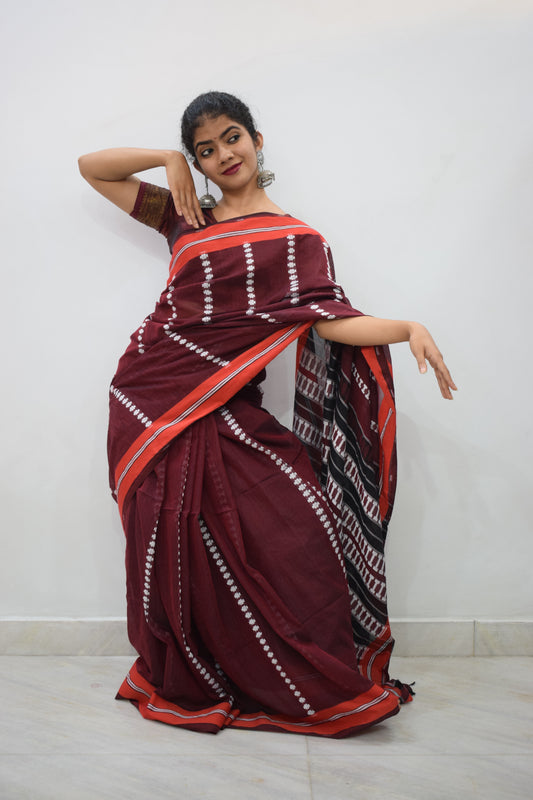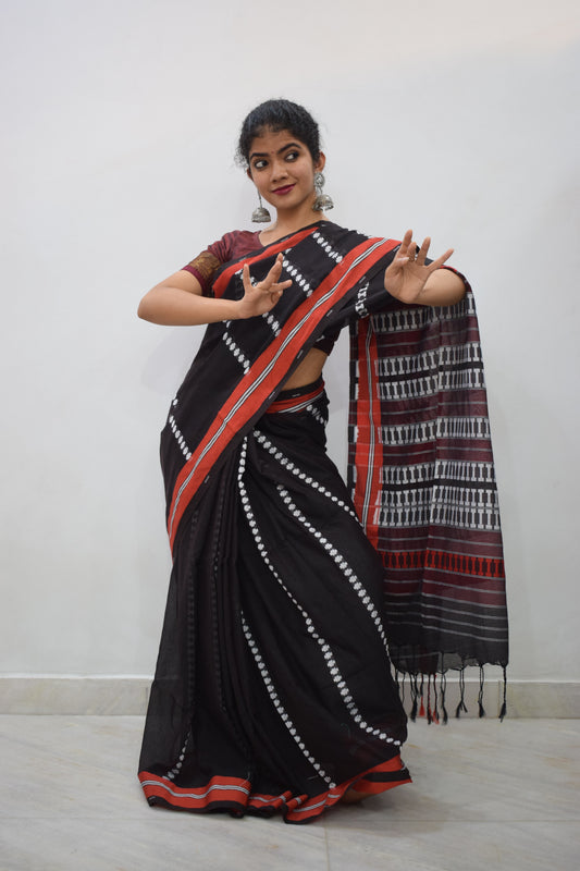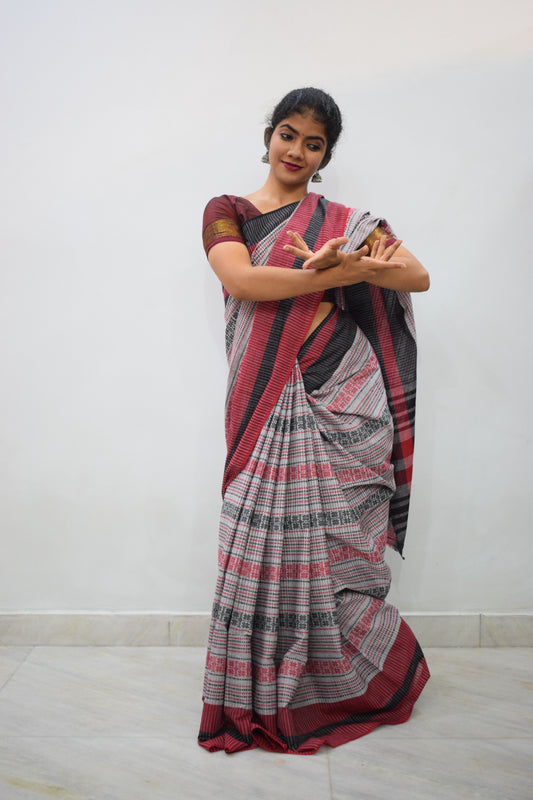 Samyuktā: Grey & Red Dhaniakhali Cotton Saree