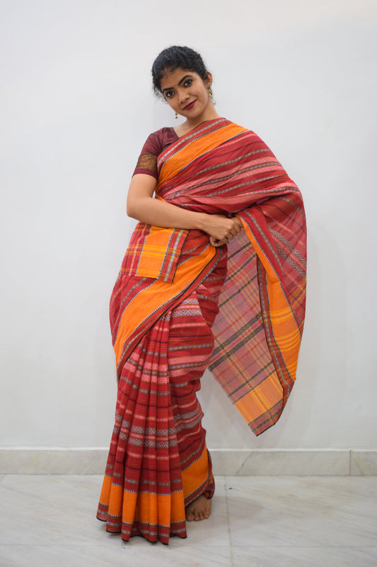 Dhananyā- Red & Yellow Dhaniakhali Cotton Saree