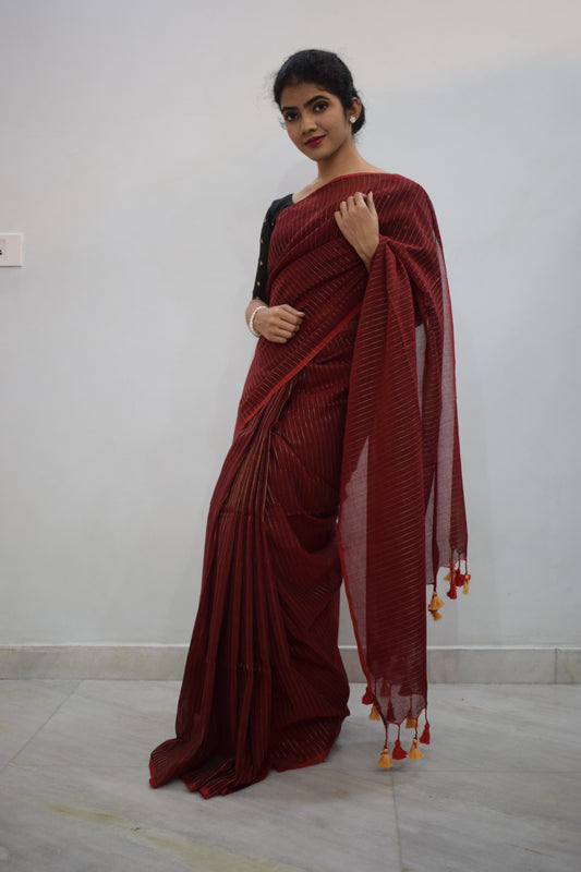 Nakshatra- Deep Red Mulmul-Zari Stripes Saree