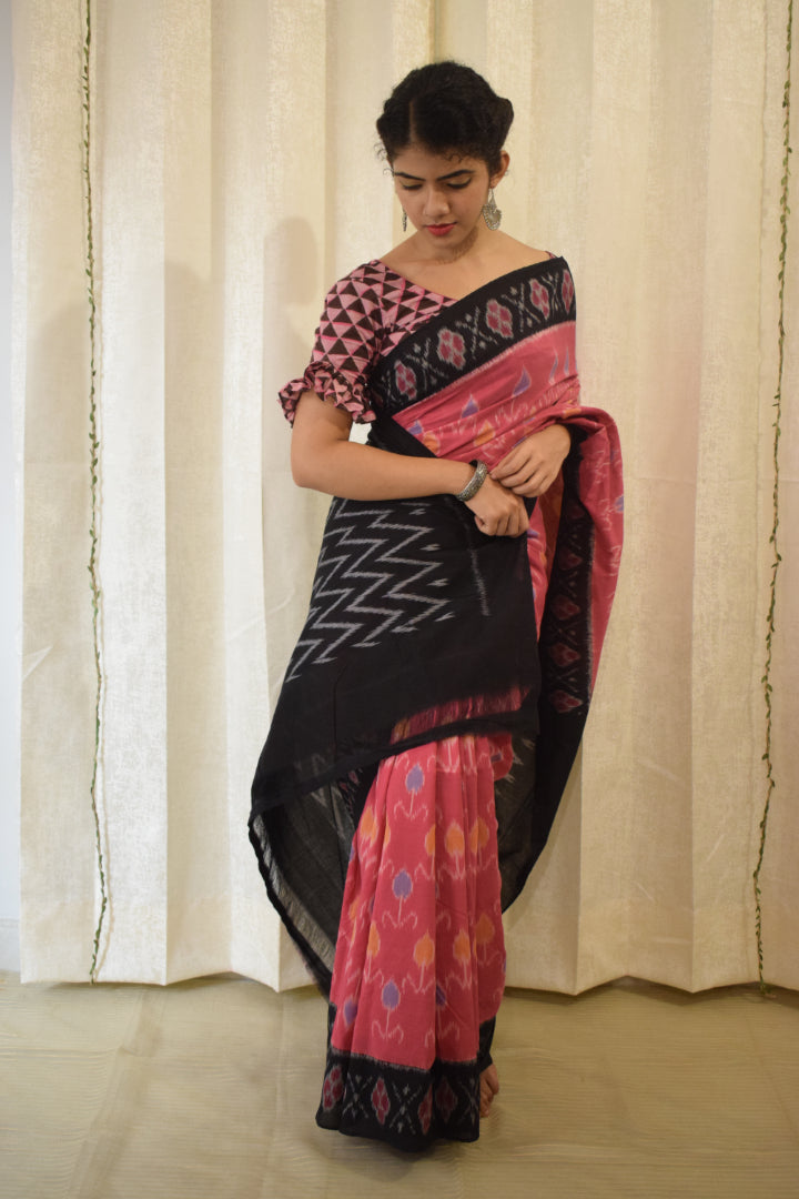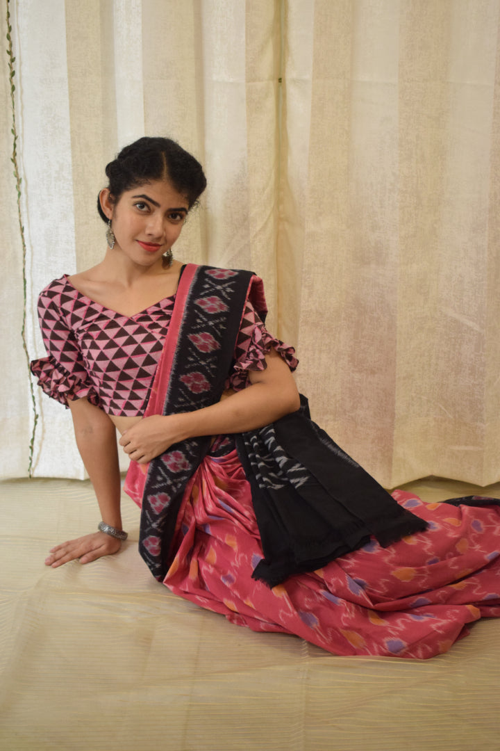 Radiating timeless elegance, this pink Pochampally ikat handwoven saree boasts of rich heritage of the handloom craft. The vibrant pink hue of the saree is accentuated by a contrasting black border and pallu, creating a striking and harmonious combination of colors. The precision of the intricate ikat patterns is a testament to the craftsmanship involved.